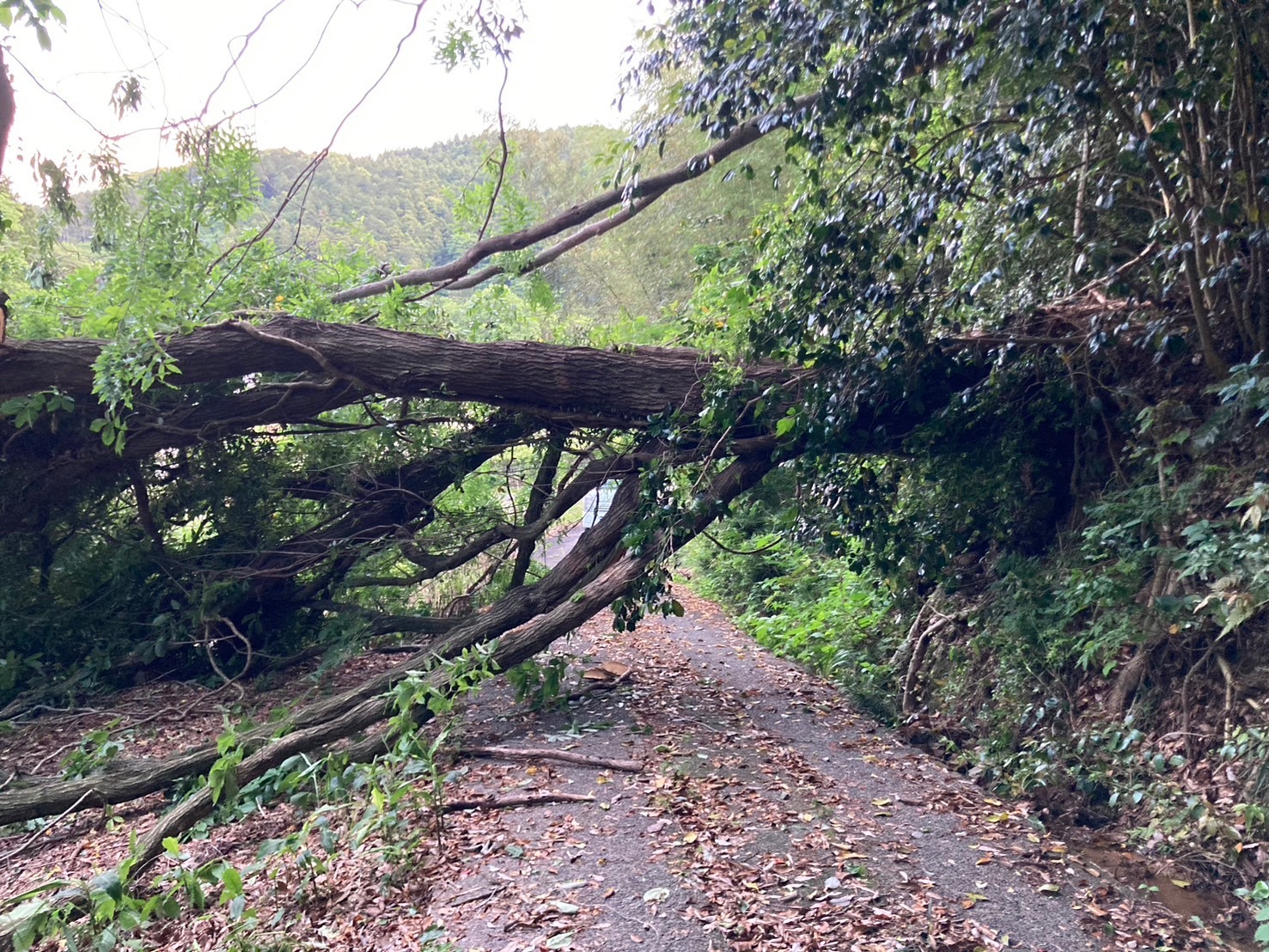 大雨の影響で倒木があり、道を塞いでしまい道路を通行することが出来ません。